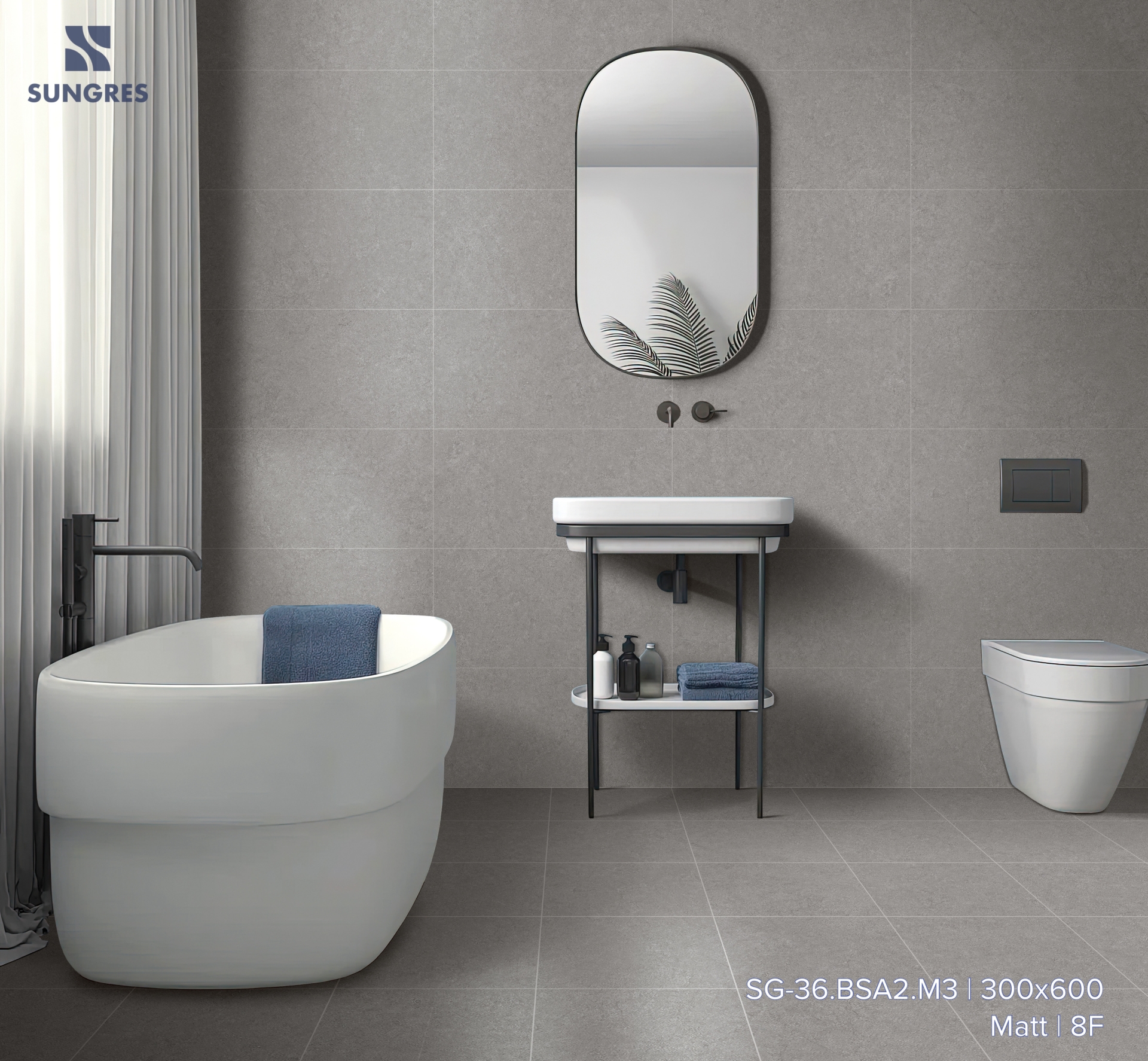 • Ý tưởng: Ốp toàn bộ tường và lát sàn bằng gạch BSA2. Sử dụng bồn tắm trắng, lavabo đá trắng và ánh sáng vàng ấm hắt từ gương hoặc khe trần. Sự tương phản này tạo nên vẻ đẹp sang trọng, huyền bí và cực kỳ sạch sẽ.