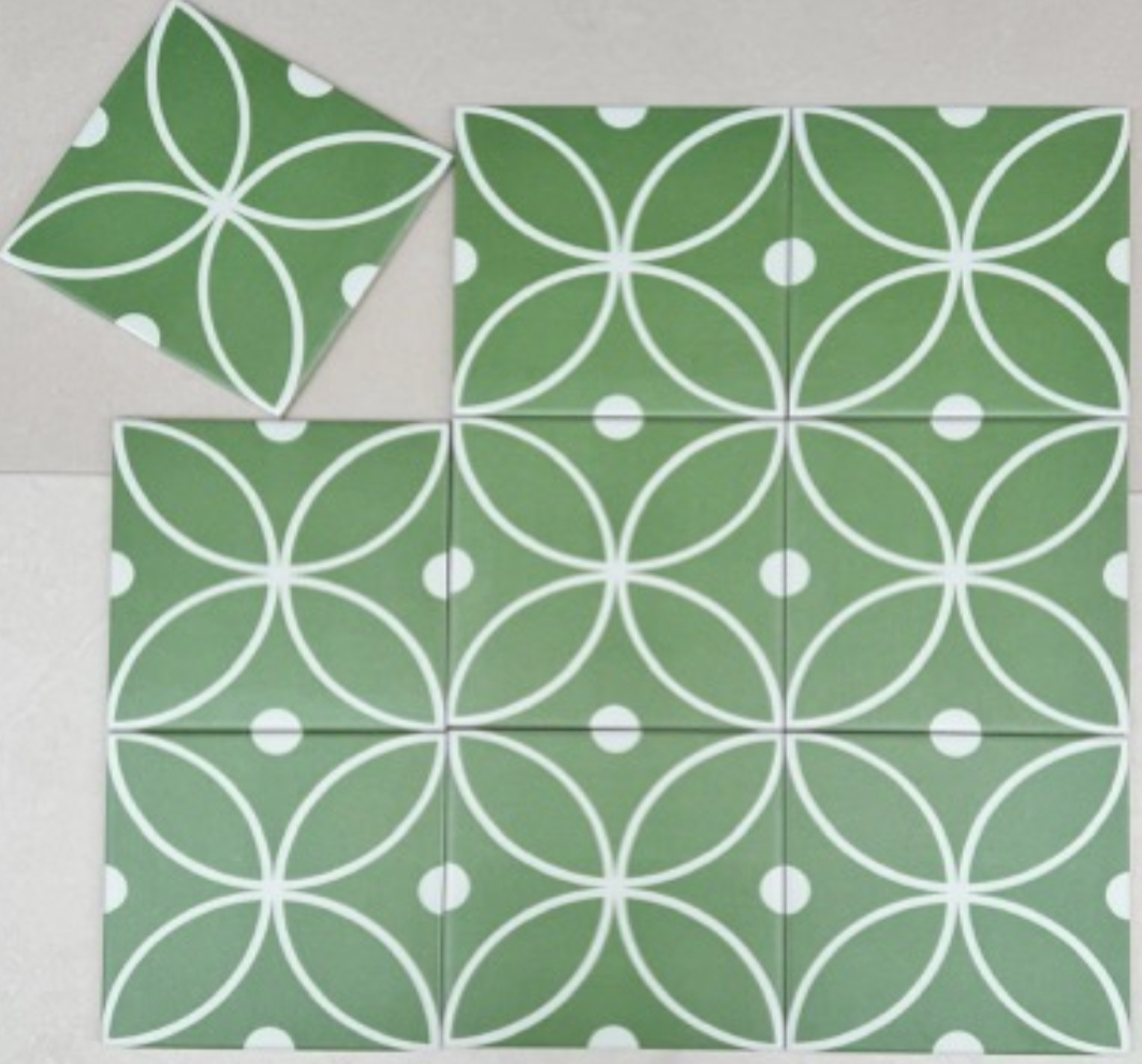 Gạch bông 20x20 đồng tiền màu xanh non hoạ tiết trắng bề mặt mờ