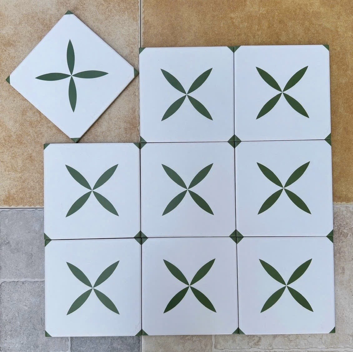 Gạch bông 20x20 màu trắng hoạ tiết lá cây xanh và hình tam giác bề mặt mờ