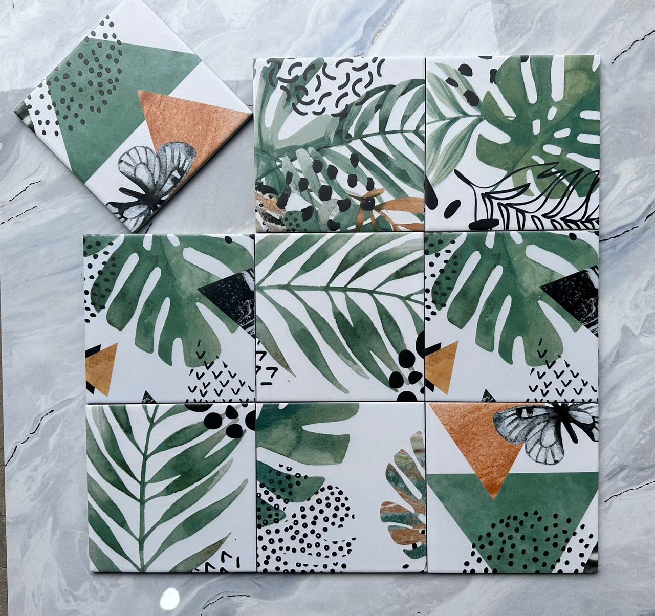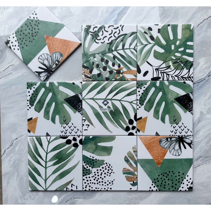 Gạch bông 20x20 màu trắng hoạ tiết lá cây xanh và hình tam giác bề mặt mờ