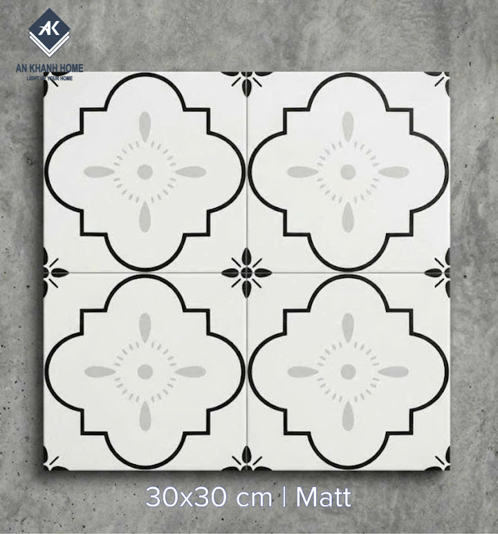 Gạch bông 30x30 nền trắng kem hoạ tiết hoa 4 cánh đen
