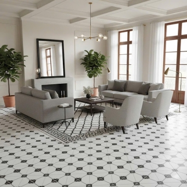 Khác với các dòng gạch bông xi măng truyền thống, mẫu gạch này có xuất xứ Trung Quốc và được sản xuất từ chất liệu xương đá porcelain cao cấp. Ưu điểm vượt trội của dòng này là độ cứng cao, khả năng chống thấm nước gần như tuyệt đối và chịu lực cực tốt. Nhờ đó, gạch không bị ố màu hay rêu mốc theo thời gian, giữ trọn tính thẩm mỹ lâu dài cho công trình.