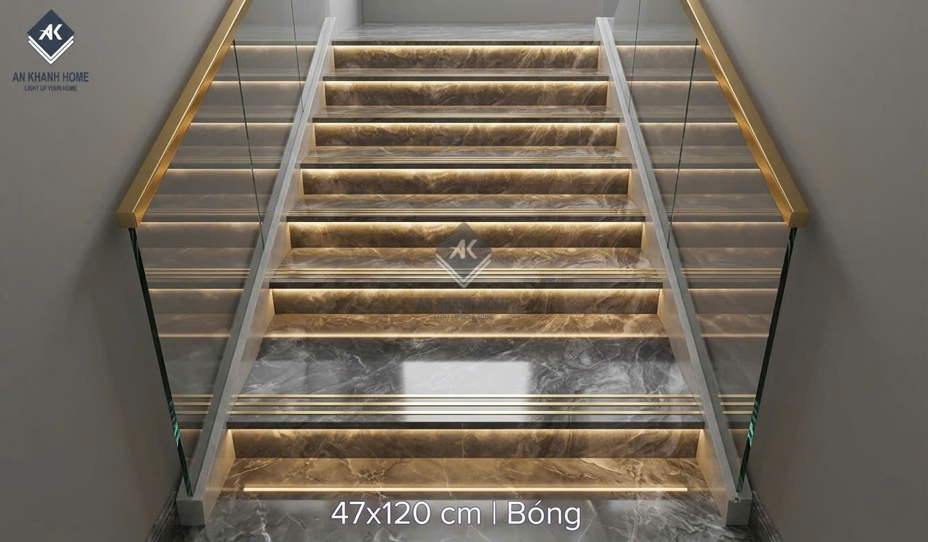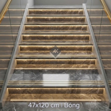 Gạch lát cầu thang 47x120 màu nâu vân đá khắc kim nhũ vàng