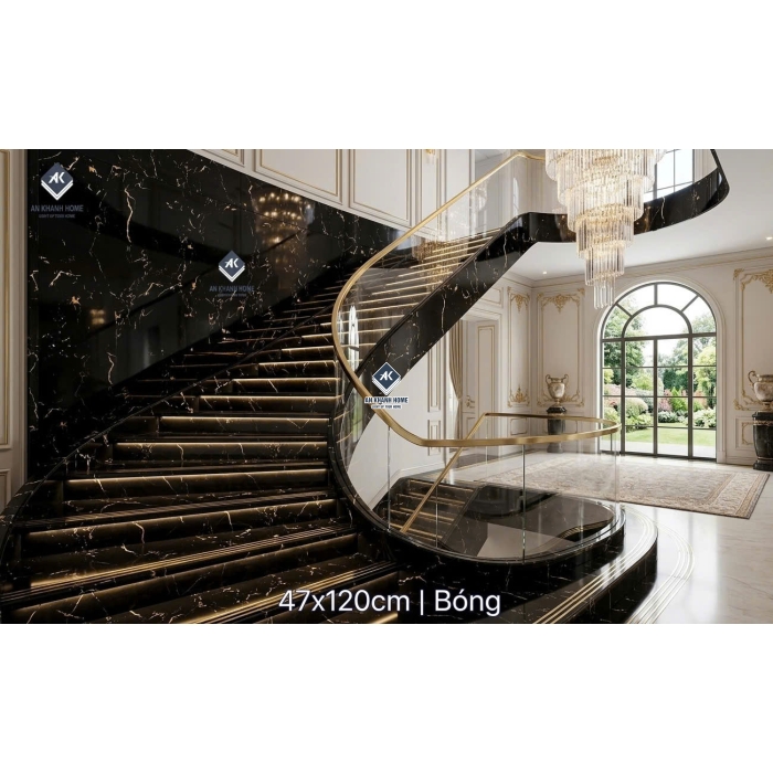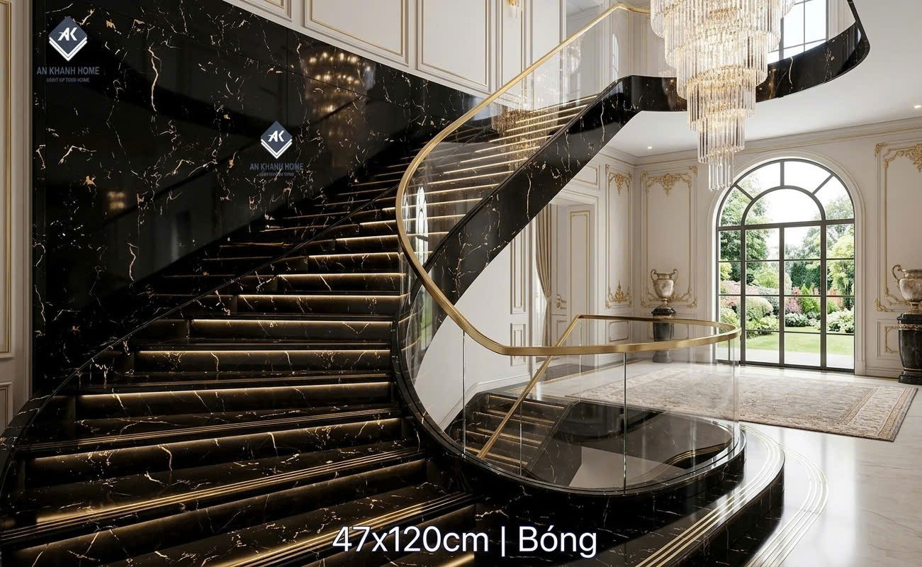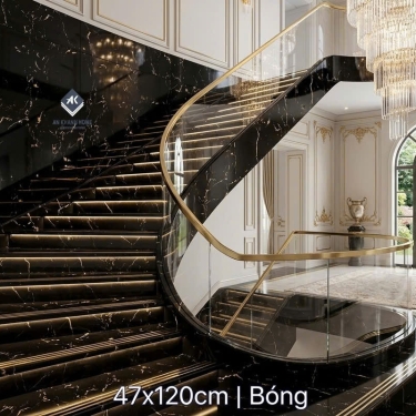 Gạch lát cầu thang đen vân đá nhũ vàng khắc kim 47x120cm
