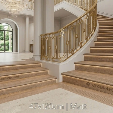 Gạch lát cầu thang 47x120 màu nâu vân đá khắc kim nhũ vàng