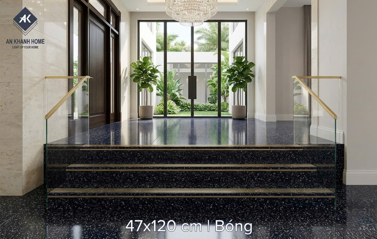 Gạch bậc cầu thang 47x120 giả đá hoa cương xanh đen nhũ vàng