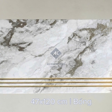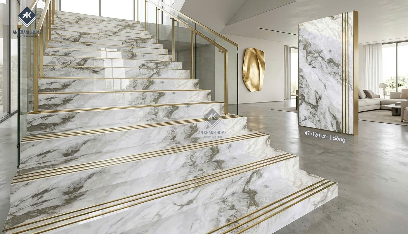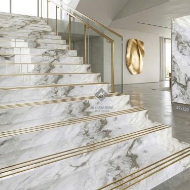 Gạch lát cầu thang 47x120 trắng vân đá marble nhũ vàng