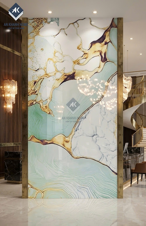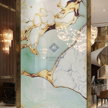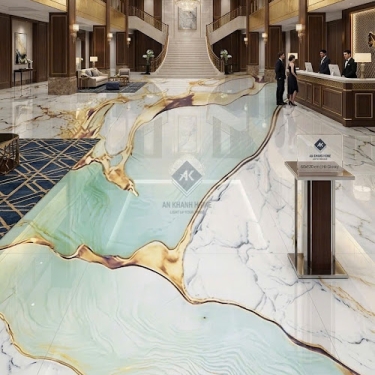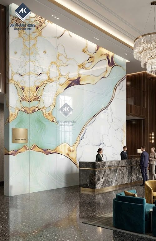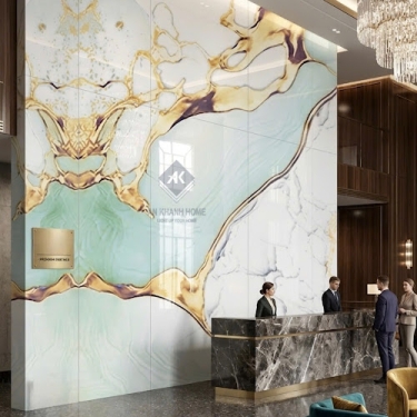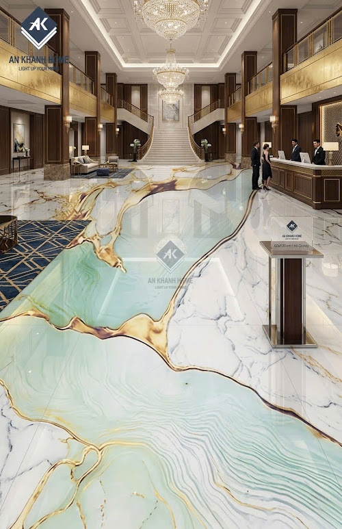 • Ốp lát phòng khách: Phòng khách là "trái tim" của ngôi nhà. Việc sử dụng gạch vân đá trắng xanh nhũ vàng sẽ biến không gian này thành một sảnh chờ khách sạn 5 sao, thể hiện sự hiếu khách và đẳng cấp của gia chủ.